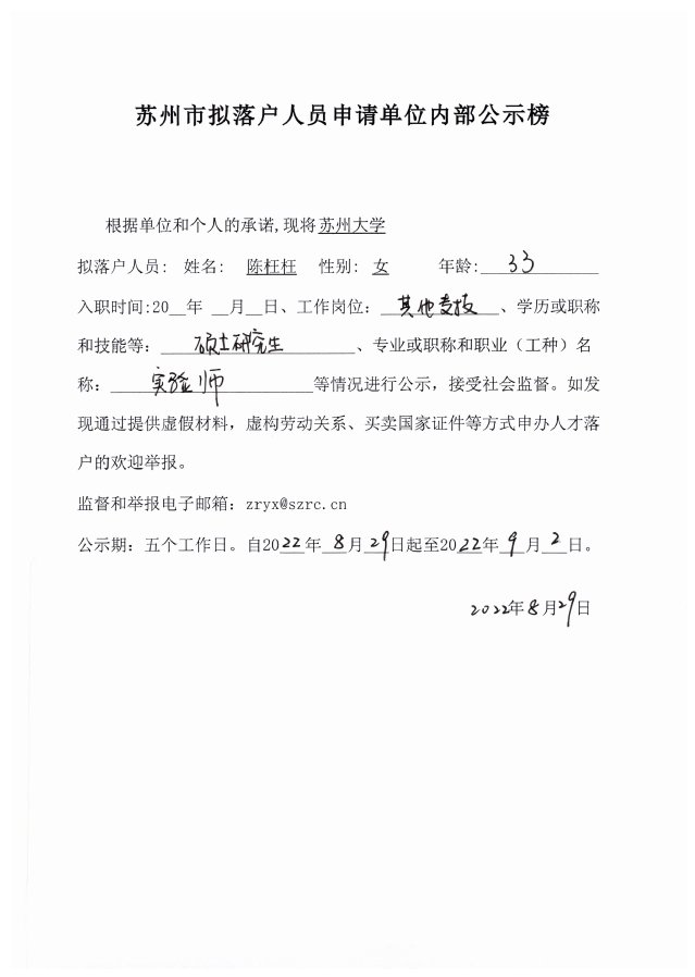 苏州实验动物中心员工陈枉枉同志申请落户苏州,现按苏州市人才服务中心要求,对其落户信息予以公示,公示期为2022年8月29日至2022年9月2日。公示详细如下: