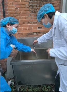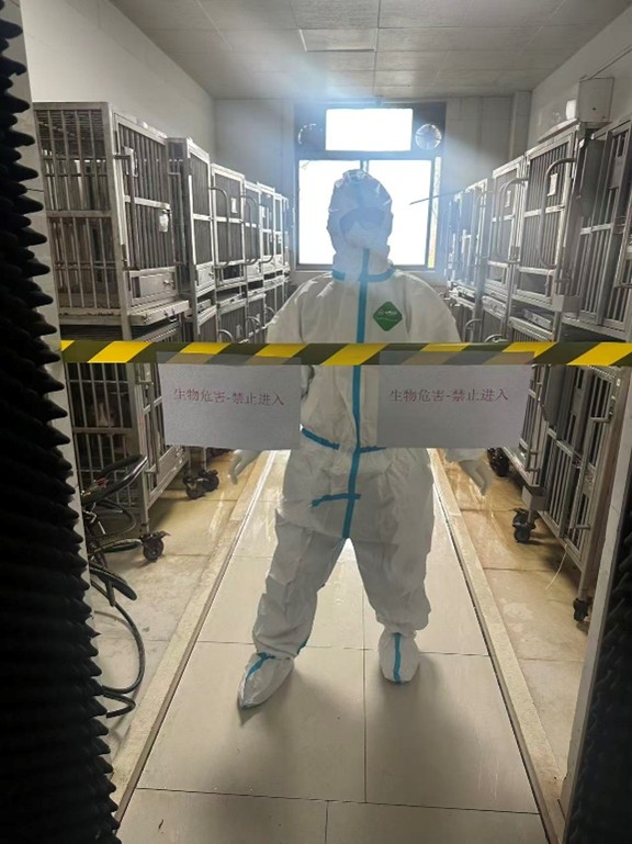 演练流程环环相扣,紧张有序。首先进入疫情发现与应急响应阶段,饲养员发现犬只异常后,第一时间关闭笼门启用物理隔离装置,严禁触碰相关物品,并迅速上报兽医及设施管理员。兽医随即封锁现场,悬挂“生物危害-禁止进入”警示牌,穿戴防护装备进入隔离区,划定警戒区并设置标识,疏散周边人群,严防无关人员进入管控区域。随后按照层级上报机制,兽医向中心主任汇报疫情,中心主任按规定上报苏州科技局、学校保卫处及实验室管理处,科技局进一步向动管办、农业农村部上报。